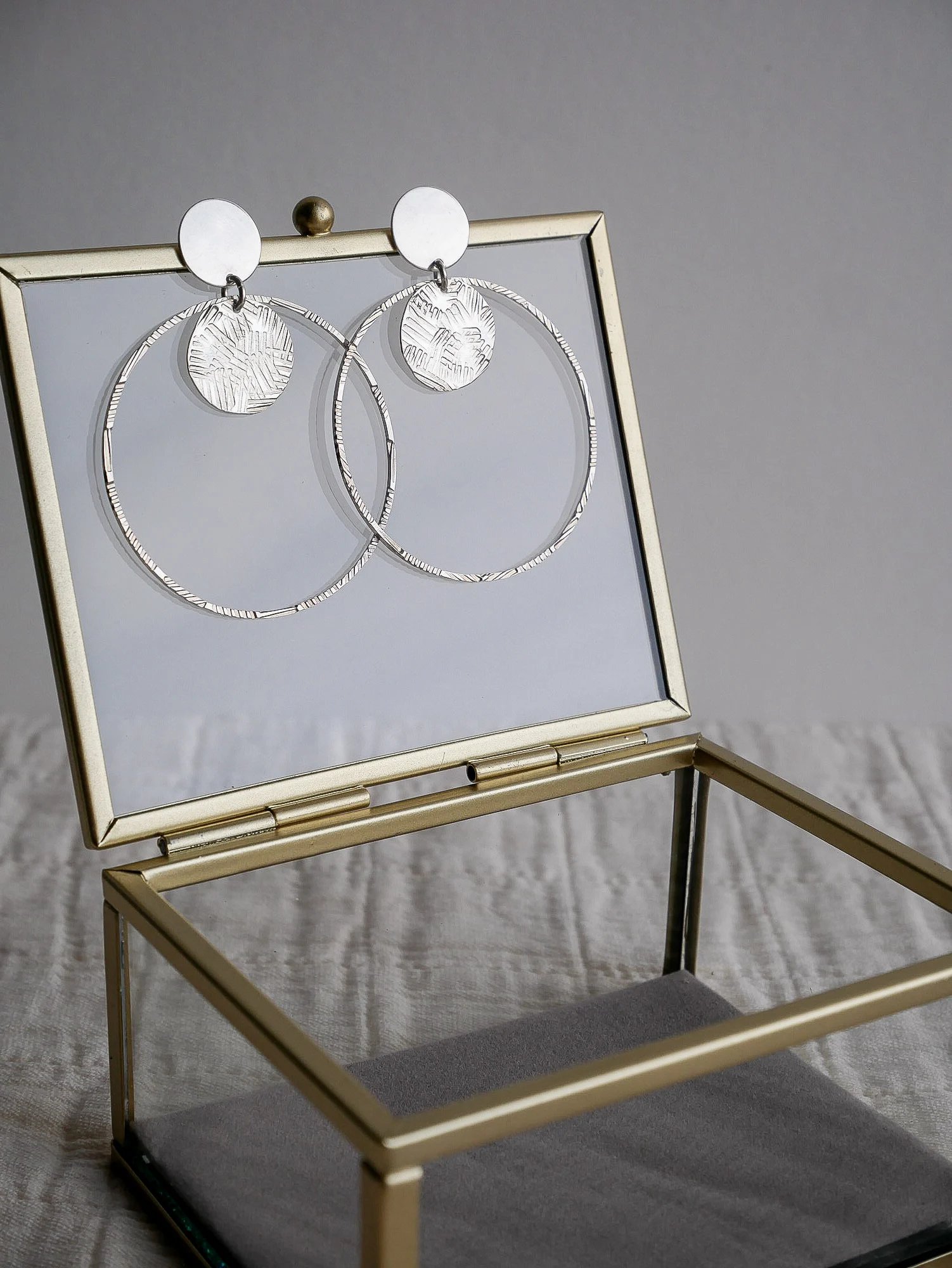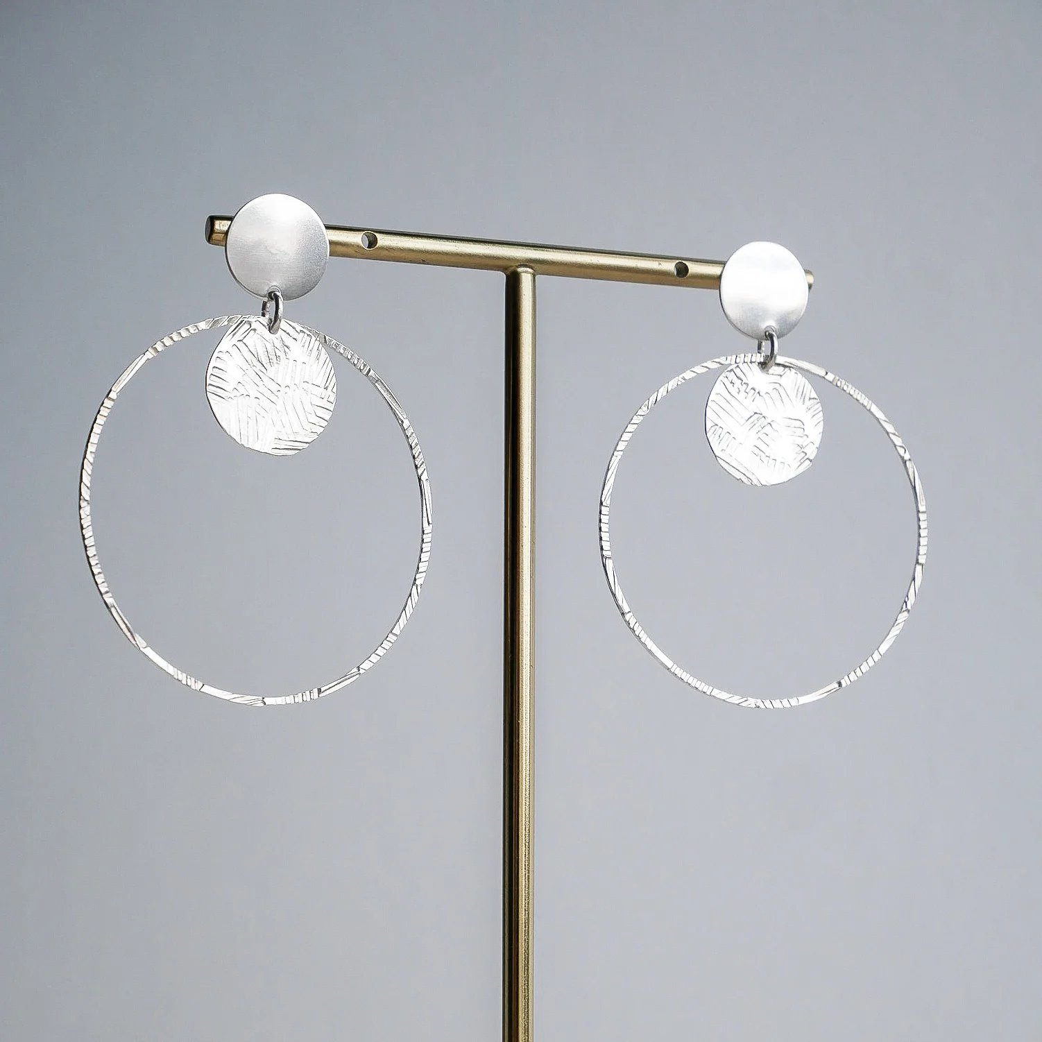 Boucles d'oreilles martelées taille XL de la gamme ANCO, dorées à l'or fin 24 carats ou plaquées argent 925. Attaches clous. Des boucles graphiques et solaires. Tous les bijoux ANCO sont martelés à la main et possèdent un marquage différent les uns des autres.