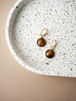 Boucles d'oreilles pendantes de la gamme ZASKIA, dorées à l'or fin 24 carats, avec pierres fines Oeil de tigre (pierre naturelle). Attaches dormeuses. Pierres coupe arrondie.
