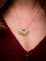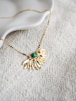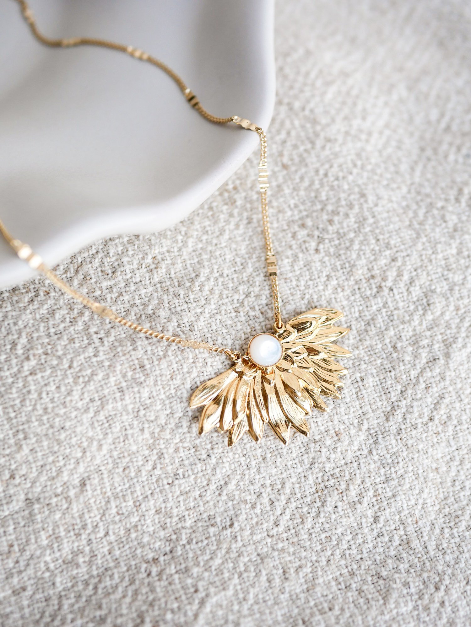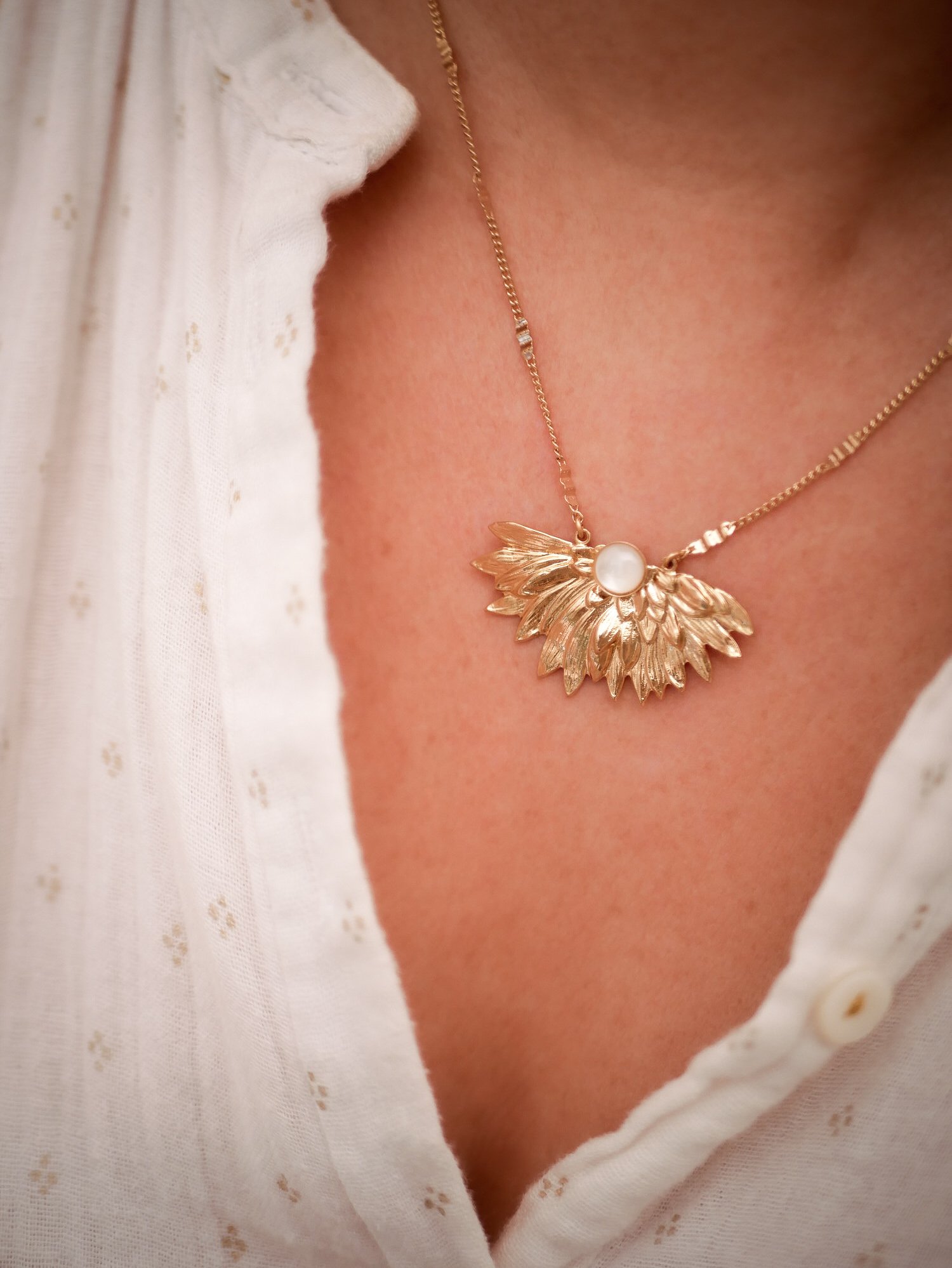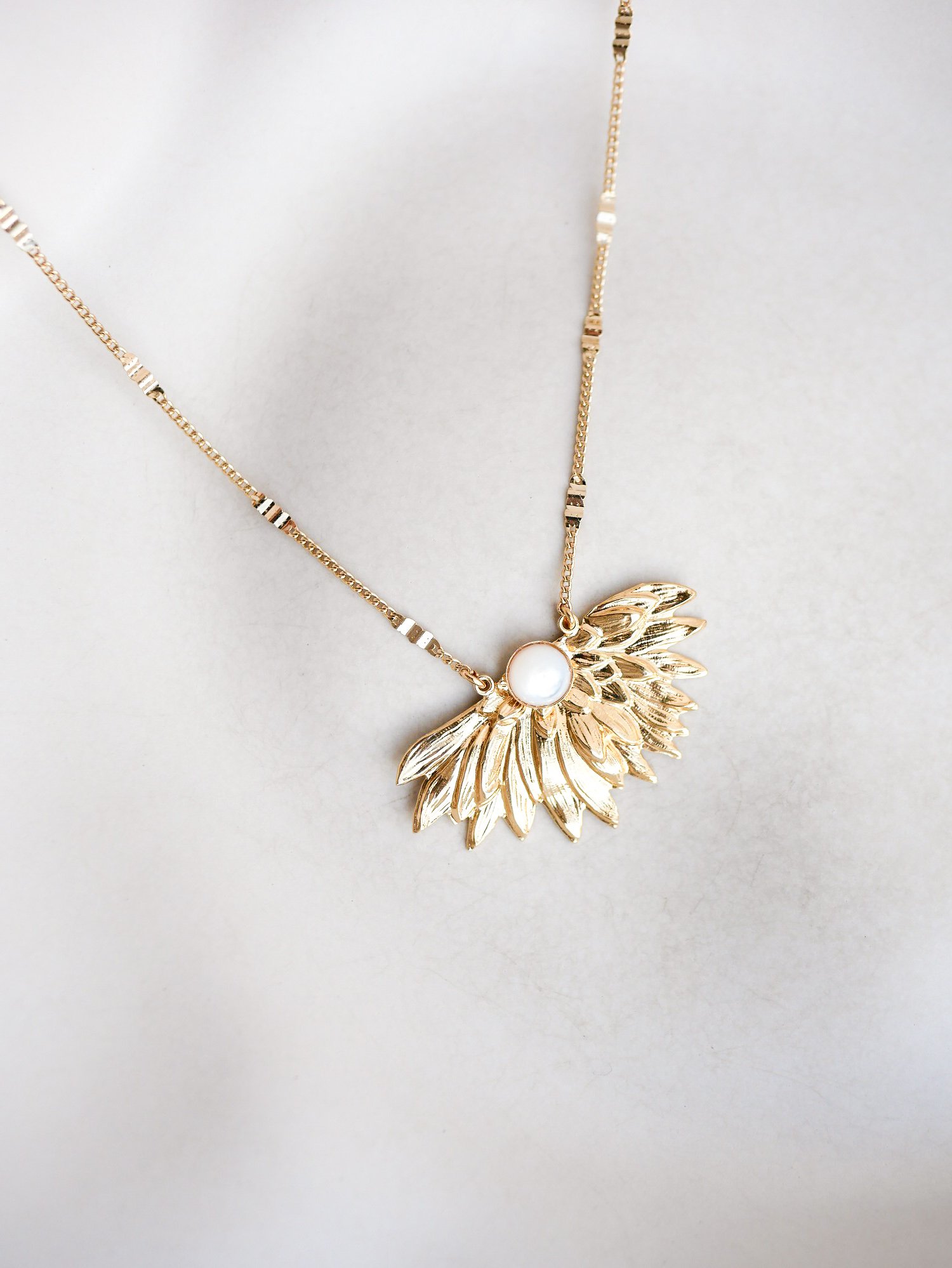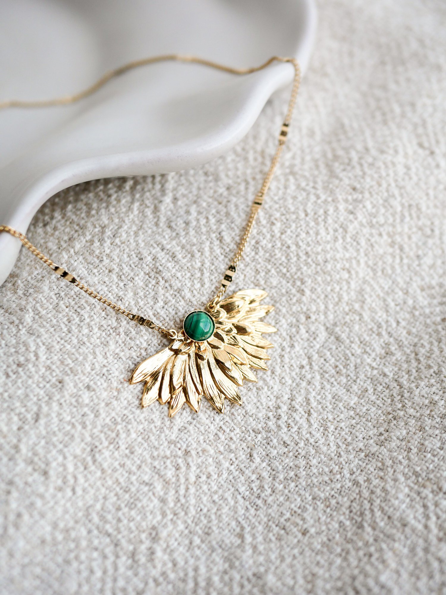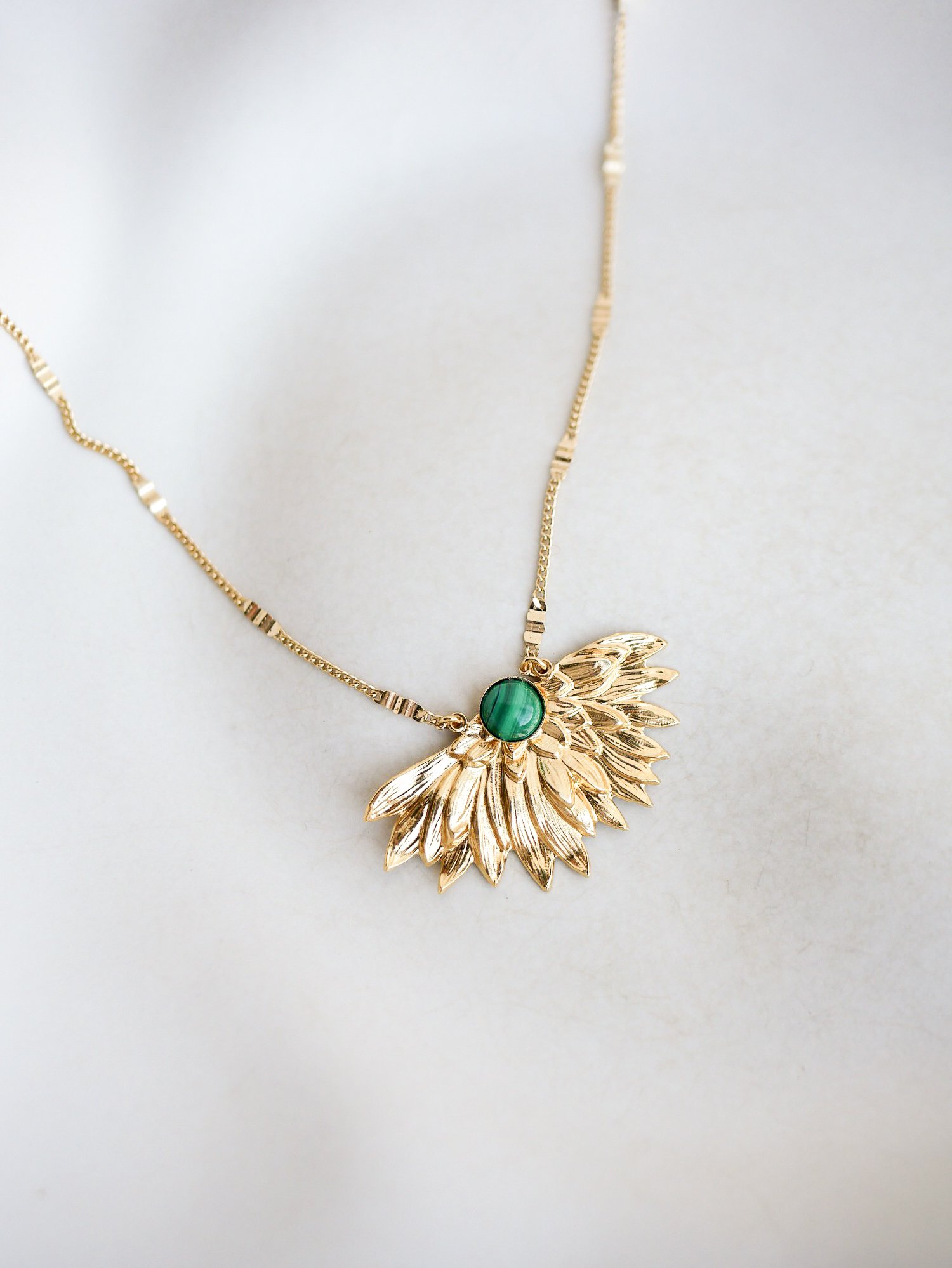 Collier de la gamme FREYJA, son sublime plumage associé à des pierres naturelles. Attache mousqueton. Doré à l'or fin 24 carats.