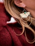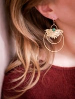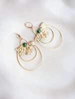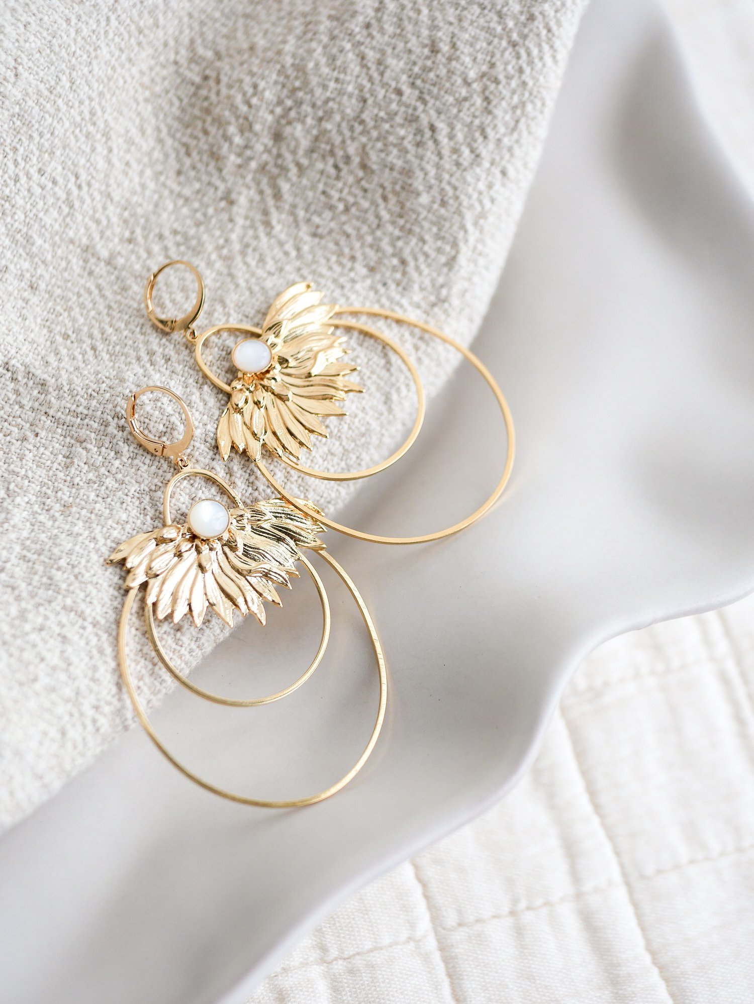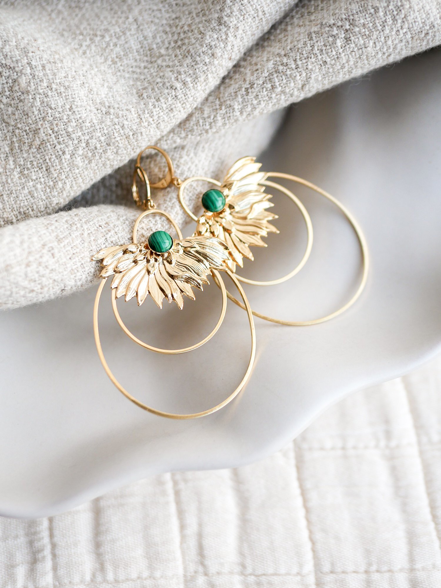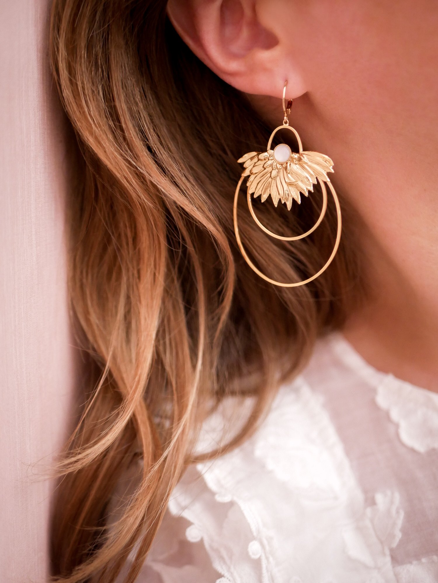 Grandes boucles d'oreilles de la gamme FREYJA, leur sublime plumage associé à des pierres naturelles. Attaches dormeuses. Dorées à l'or fin 24 carats.