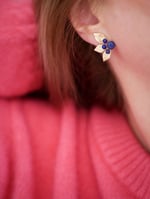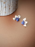 Puces d'oreilles de la gamme ISADORA, sublimes feuilles associées à de la sodalite (pierre naturelle). Attaches clous. Dorées à l'or fin 24 carats ou plaquées argent 925. Pierres coupe arrondie.
