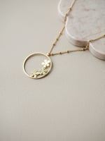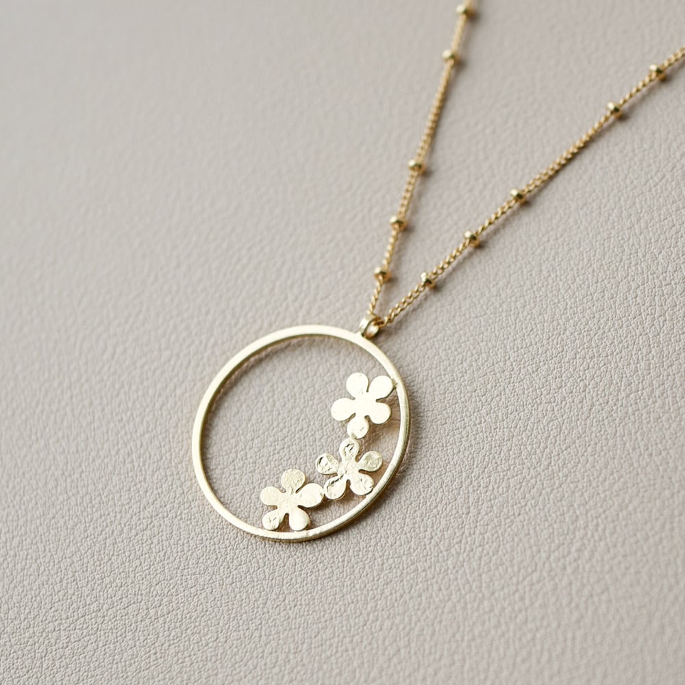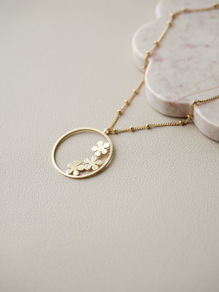 Sautoir de la gamme MYRIA avec son pendentif rond et ses petites fleurs martelées sur une jolie chaîne à billes. Attache mousqueton. Doré à l'or fin 24 carats.